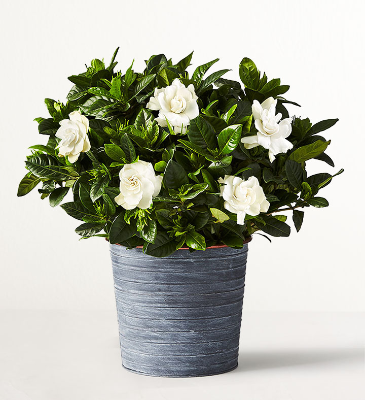 Gardenias have long been prized for their lush fragrance as well as their elegant white flowers and abundant glossy leaves. We designed ours in a ribbed slate-and-copper planter to accentuate its timeless allure.